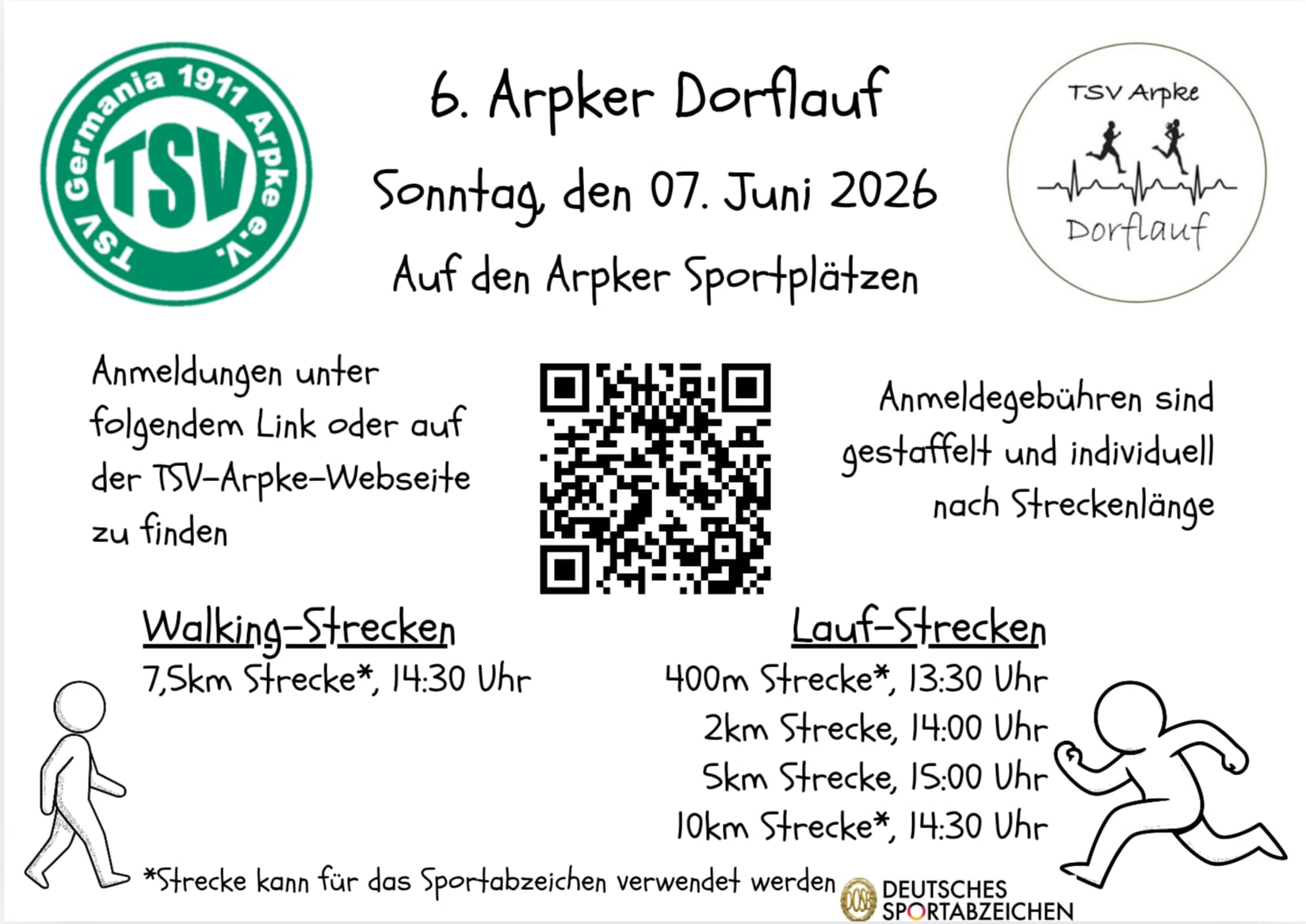 Am 7. Juni 2026 ist es wieder soweit. Ab 13:30 Uhr starten wir zum 6. Arpker Dorflauf.